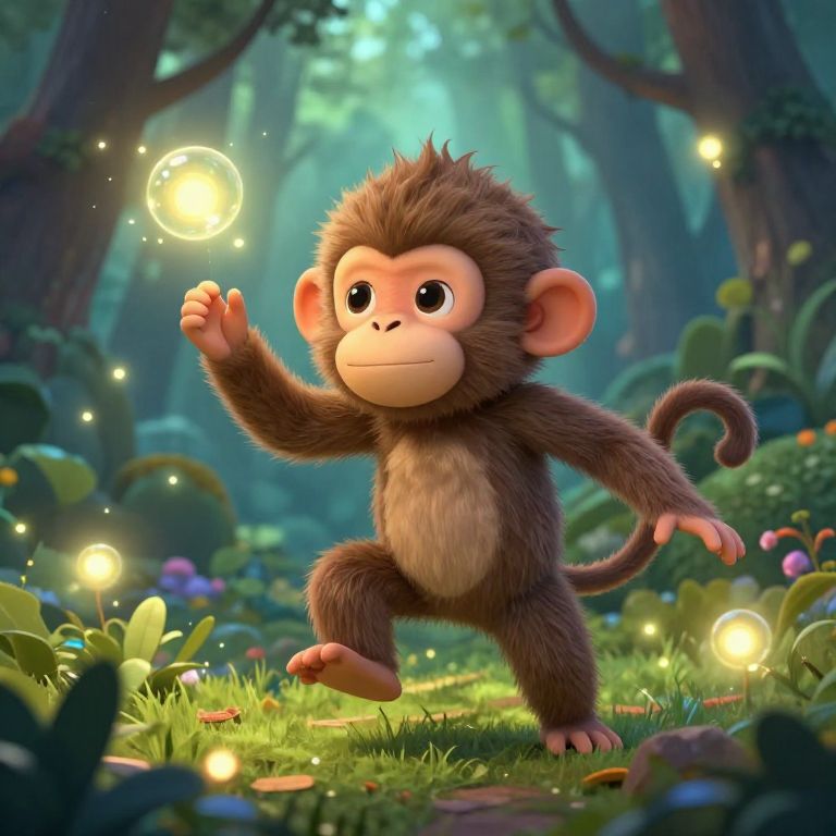 Cute, cartoon-style brown monkey with large eyes and fluffy fur, standing on one foot in a magical forest, touching a glowing floating light. Digital