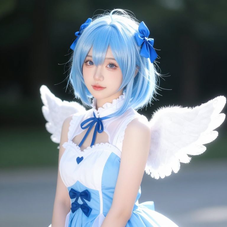 Photograph of a young woman in a blue cosplay outfit with blue fox ears, white feathered wings, red shorts, and a yellow belt, standing