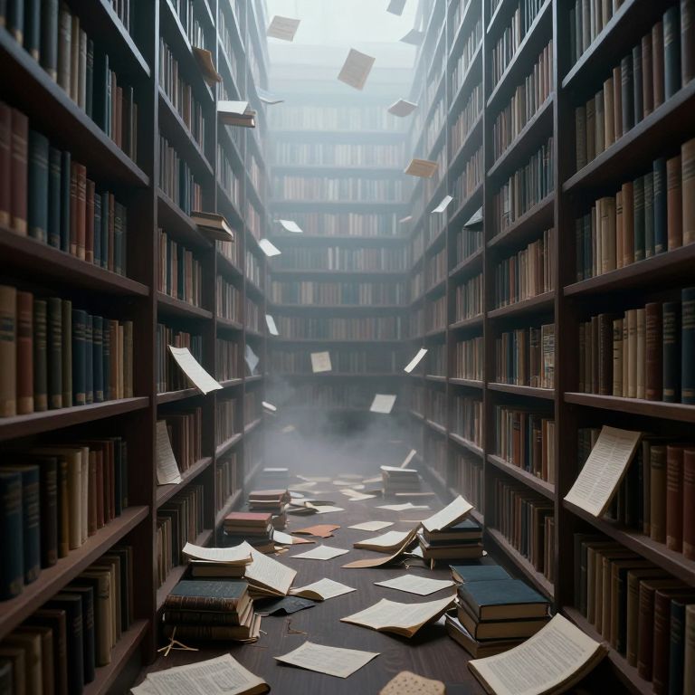 An atmospheric, cyberpunk-inspired digital artwork depicts a surreal library with towering shelves lined with unreadable books, their scattered pages forming a mysterious pathway leading into a foggy, dreamlike landscape where reality blurs with imagination.