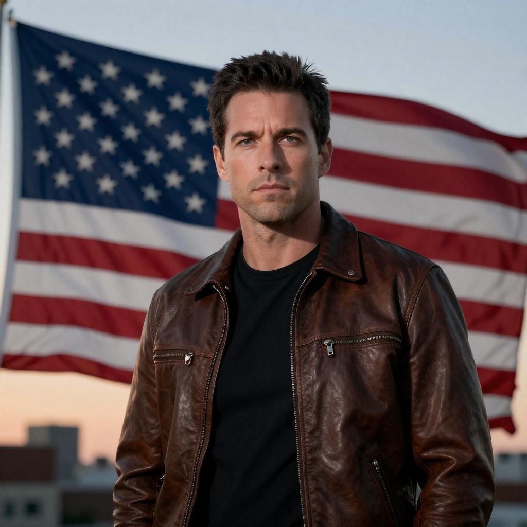 Photograph of a muscular, serious-looking man with short brown hair and light stubble, wearing a black shirt. He stands with arms crossed, right side of his face illuminated. Background: fiery explosion, burning American flag, silhouetted helicopters, dark cloudy sky. Sparks fly around him. Intense expression on his face. Man centered, flag on right, explosion and helicopters in background.