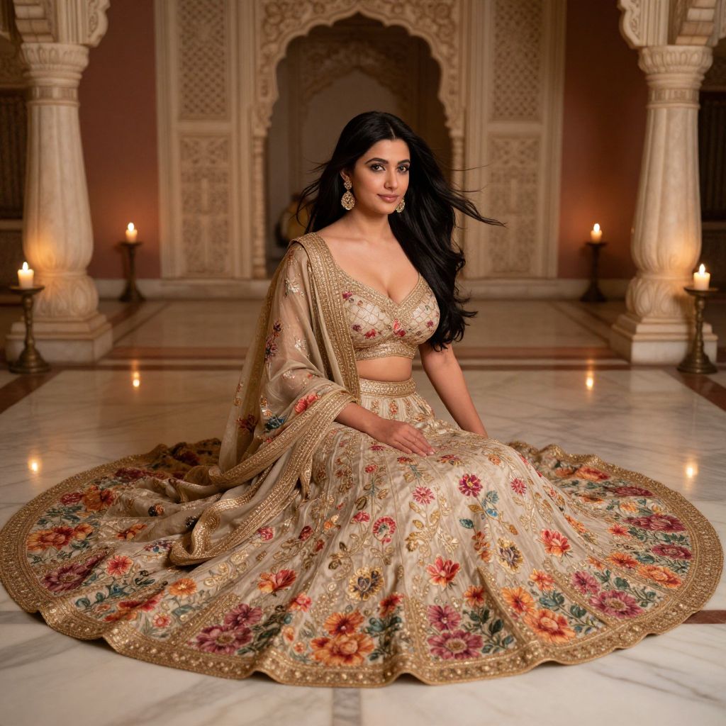Photograph of a South Asian woman with long black hair, sitting on a marble floor in an ornately decorated room. She wears a gold and cream floral embroidered lehenga with a deep V-neck top, accentuating her ample cleavage. The lehenga has a large, circular skirt adorned with intricate floral patterns. She has fair skin and wears large gold earrings. The background features carved archways, lit by warm candlelight, adding a romantic ambiance. The room's walls are a soft pink, and the marble floor is polished and reflective. The overall style is opulent and traditional.