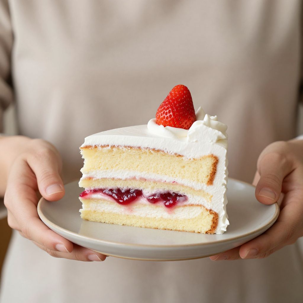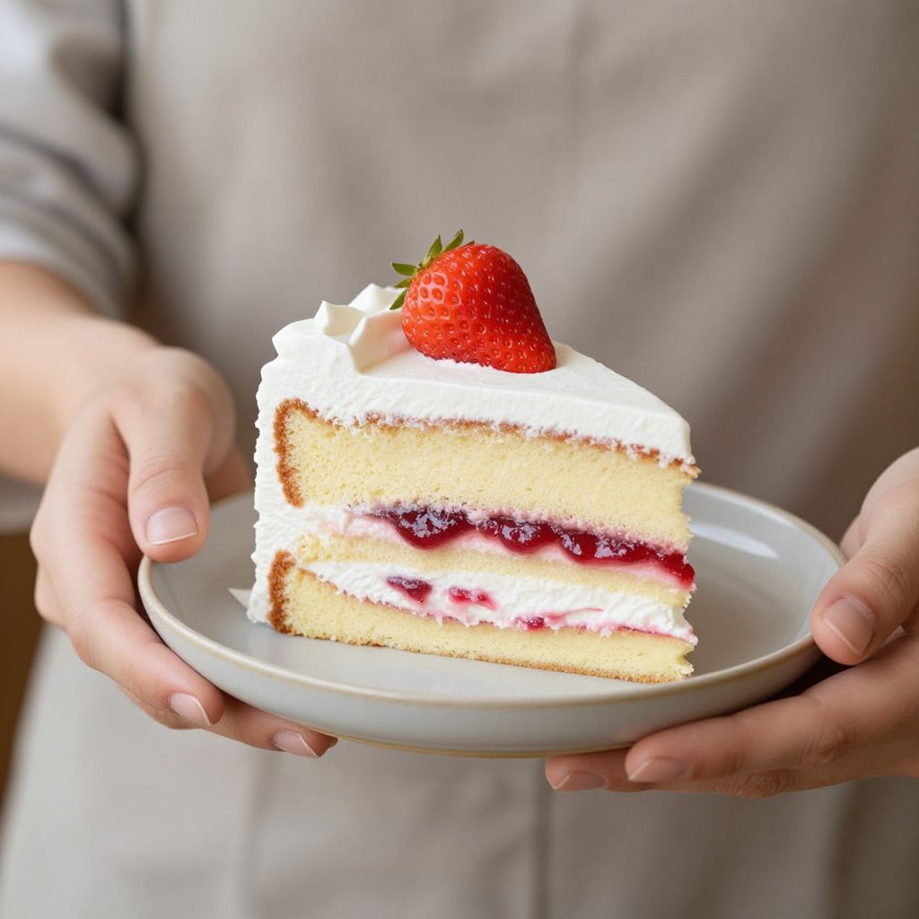 Woman presenting a slice of vanilla cake topped with whipped cream and a fresh strawberry, garnished with raspberry jam filling between layers, held elegantly on a small beige plate.
