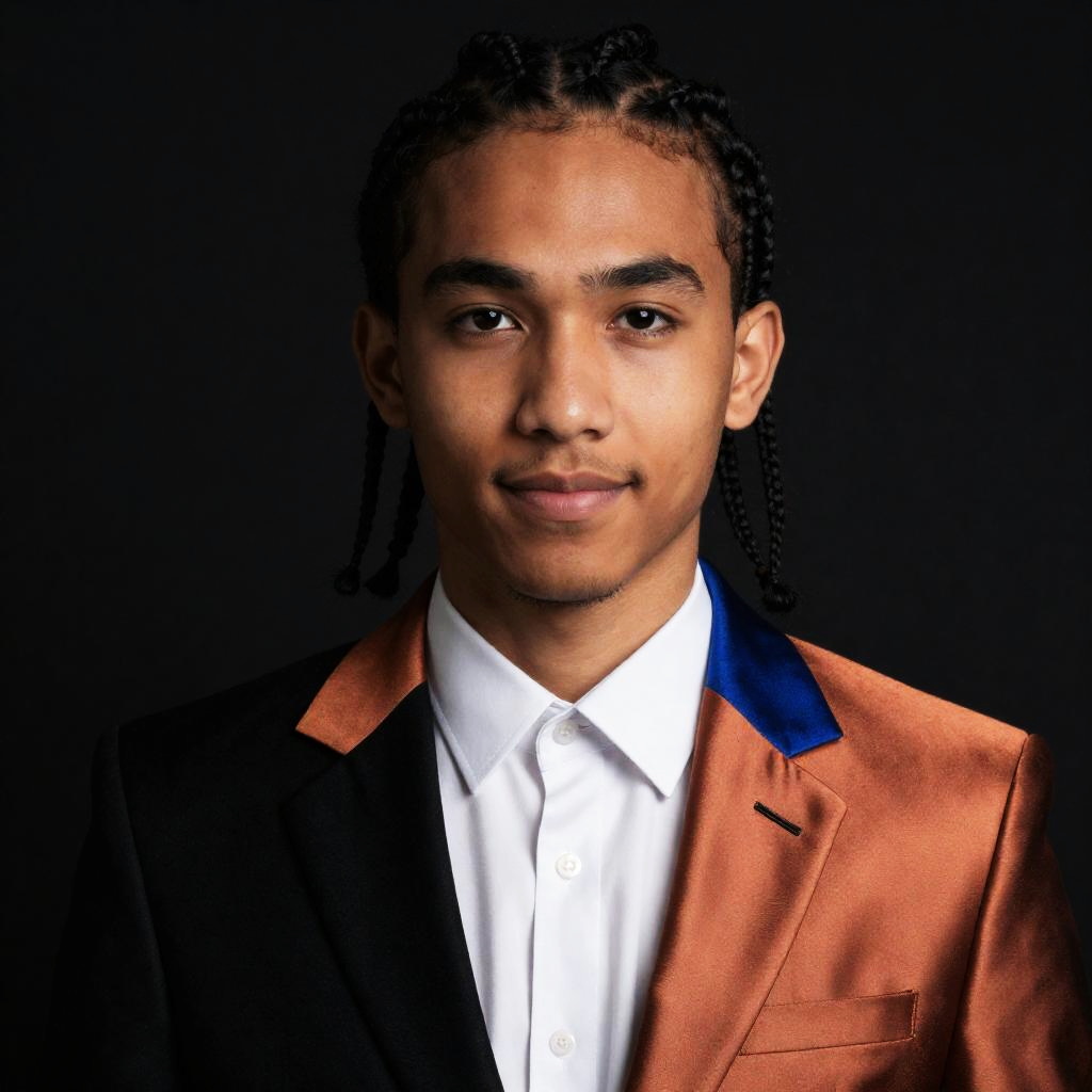 Upper body, 1boy, solo, confident young man with tousled hair and a charming smile, black eyes, closed mouth, looking at viewer, formal attire, white collared shirt, black suit, emerald, magenta, black background