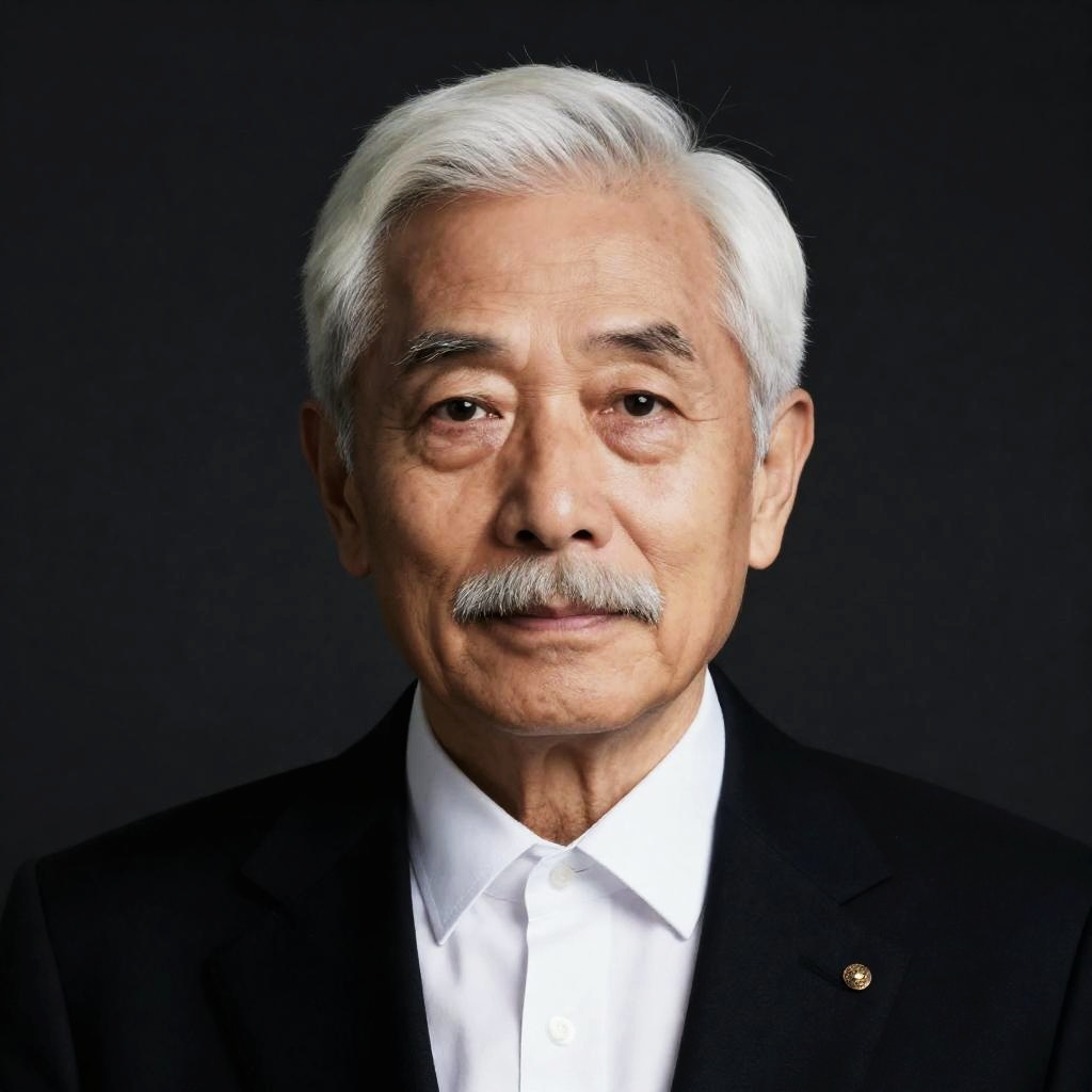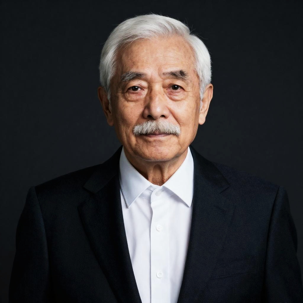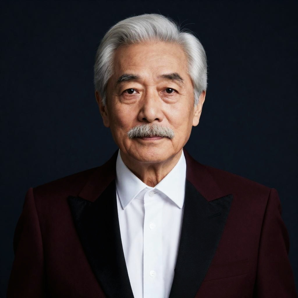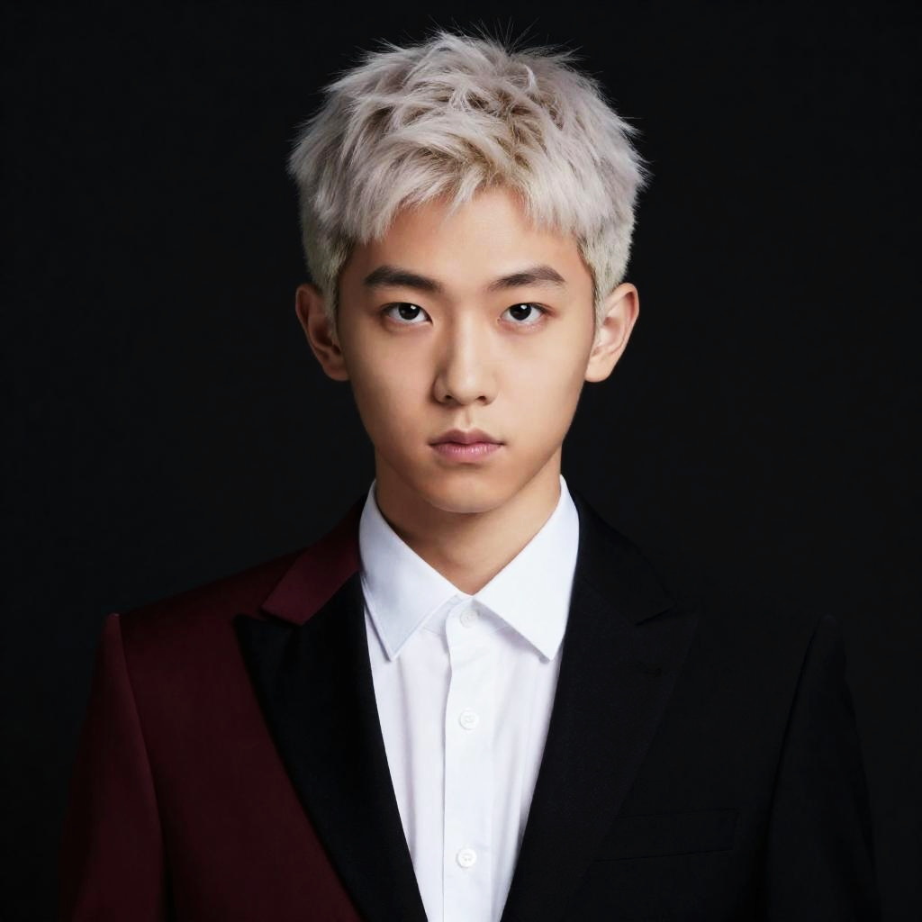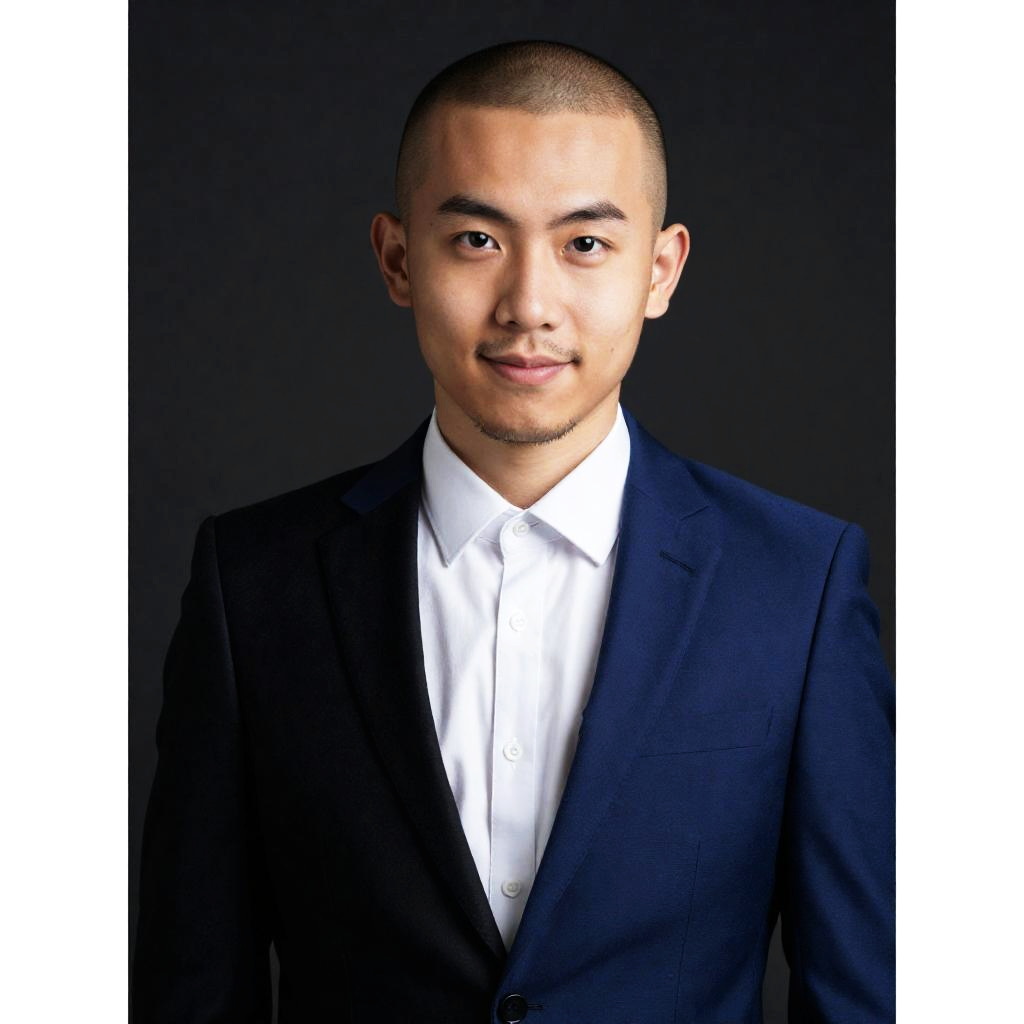 Portrait of a young Asian man wearing a black suit, white shirt, and green tie. He has thick wavy dark brown hair and a slight smile, standing against a solid dark green background.