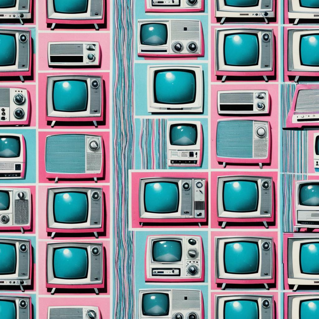 A surreal, vintage-inspired pattern featuring multiple illustrations of retro analog televisions with blue screens set against a vibrant bubblegum pink geometric optical illusion background. The design incorporates elements of psychedelic art and moiré patterns, creating a visually striking and hyperrealistic collage.