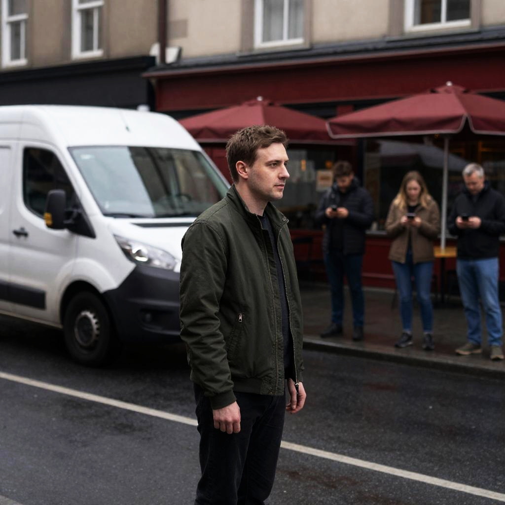 Photograph of a man with dark hair, medium build, wearing a black jacket over a plaid shirt, and blue jeans, walking briskly on a train platform. Background shows a crowd of people standing near the tracks. Overhead structure and trees visible in the distance. Man's face shows determination. Train tracks run parallel to the platform. Sunlight casts shadows.