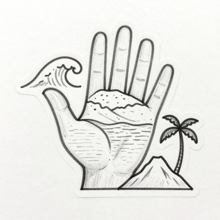 Pencil Sketch a stylized simple line sticker, include image combine a abstract hand build by wave, island, ocean, mountain, palm tree,