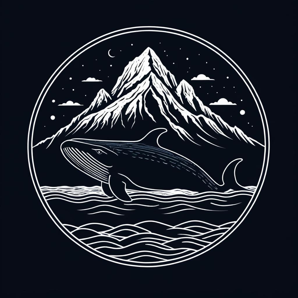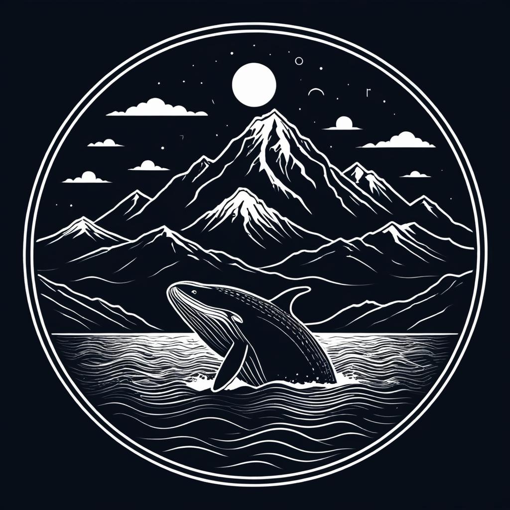 Monochrome high dynamic range line art logo featuring a zen-inspired whale breaching in water, set against a backdrop of prominent mountain silhouettes under a night sky with moon and clouds. The design emphasizes themes of wisdom and spirituality in a 2D minimalistic style.