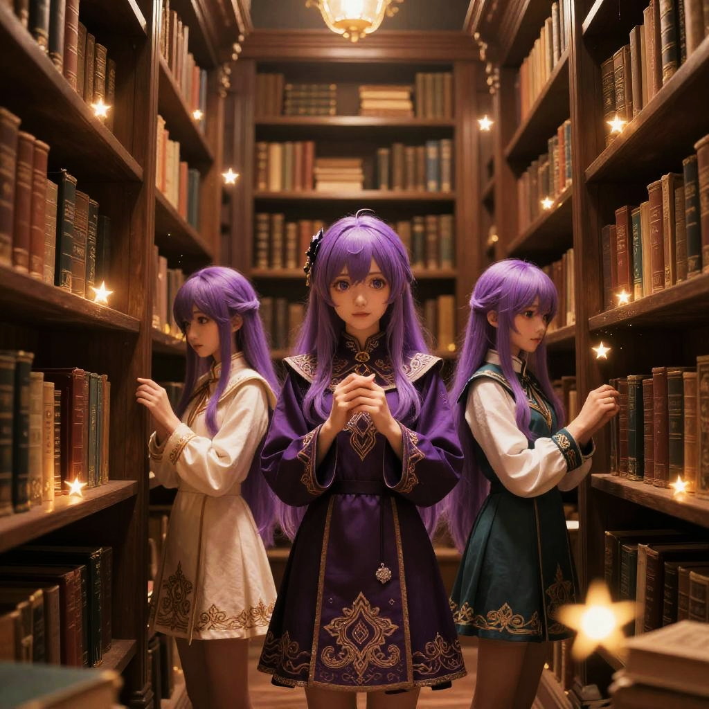 Purple haired anime girls standing in a mystical forest, wearing flowing kimonos with intricate floral patterns, soft glowing lights around them, a dreamy sunset sky in the background, delicate cherry blossom petals falling gently, highly detailed anime style