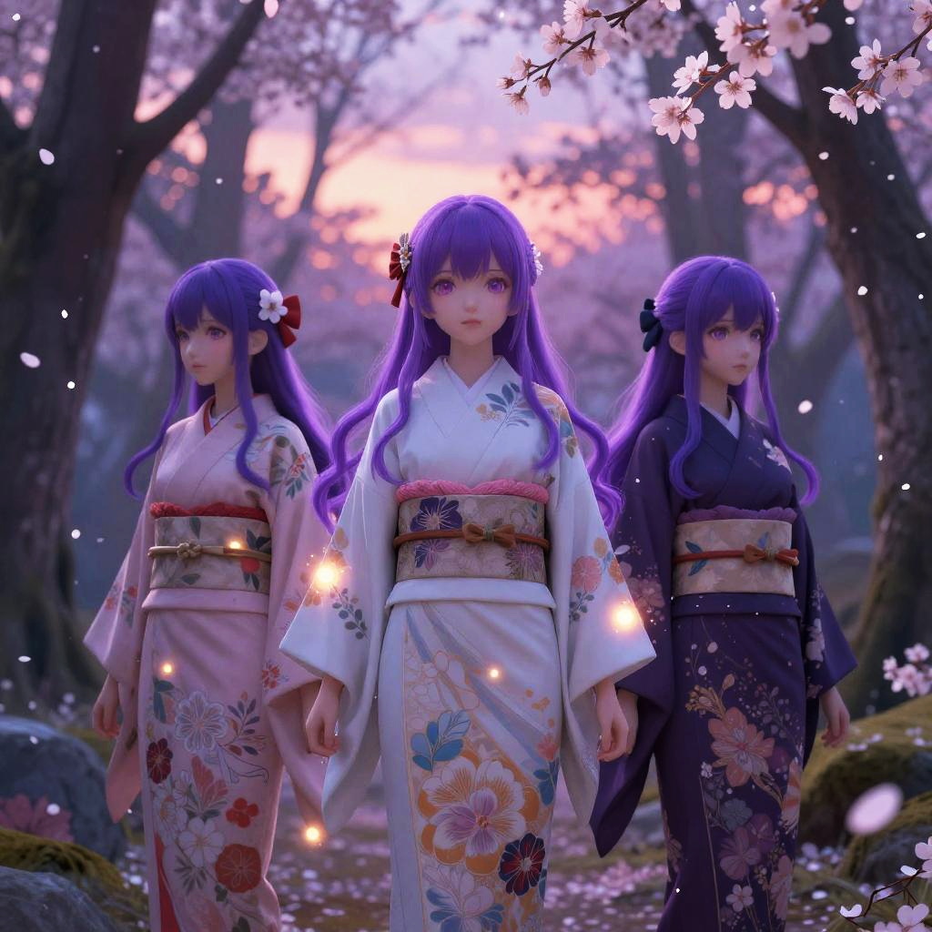 Three anime-style purple-haired girls standing in a mystical forest during sunset, wearing flowing traditional Japanese kimonos with intricate floral patterns. Soft glowing lights surround them as delicate cherry blossom petals fall gently around. The scene is highly detailed with a dreamy atmosphere.