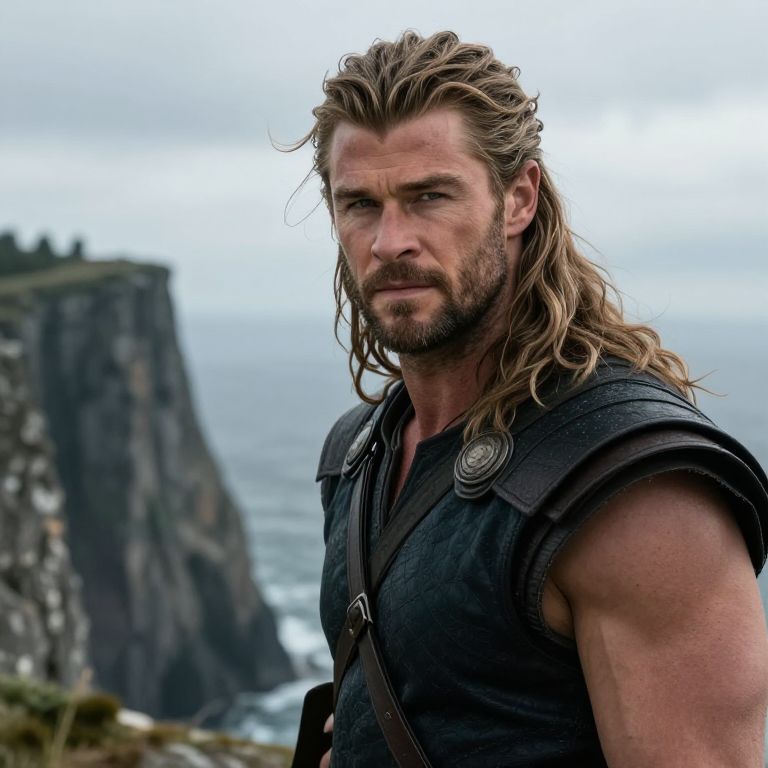 Chris Hemsworth smoking a cigar at a stylish outdoor patio during golden hour, casual leather jacket, intense gaze, modern urban vibe, photorealistic