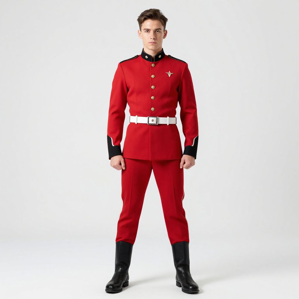 Male trapeze artist costume, 1boy, male focus, solo, military, military uniform, uniform, boots, red pants, standing, white background, belt, weapon, full body, simple background, clenched hand, brown hair