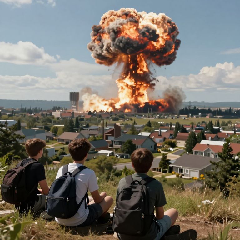 Teenagers on a hill overlooking a suburban town, witnessing a nuclear explosion in the distance, created using the Unreal Engine in a 4k, ultra-realistic render.