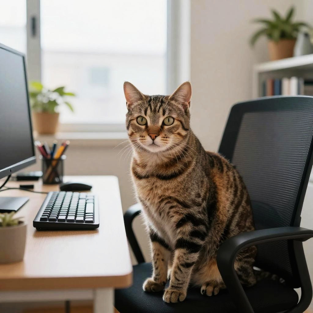 Masterpiece, best quality, 8K, photorealistic, cat on chair, working in the office