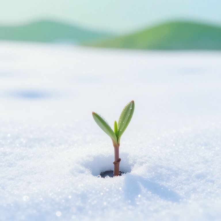A lone sprout pushing through icy snow in early spring, droplets of melting frost sparkling in the light, vast snowy landscape in the background transitioning into green hills, symbolizing renewal and hope, rendered in soft pastels with a delicate touch.
