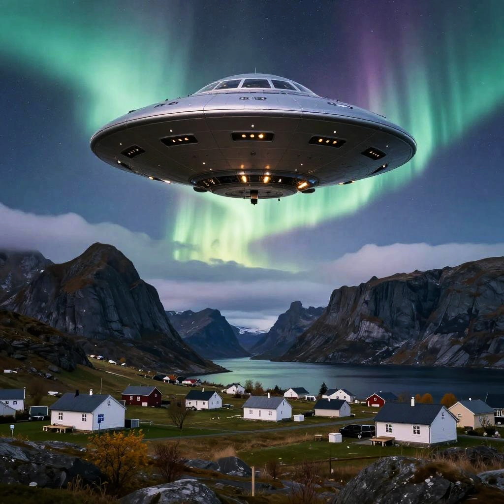 UFO Norway landscape with a silver flying saucer landing near a remote mountain village, vivid northern lights swirling in the sky, dramatic clouds and rugged terrain, cinematic realism