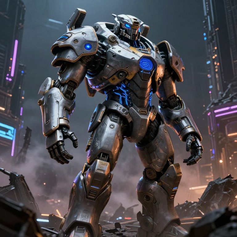 Digital CGI image of a towering, futuristic, silver and blue robotic warrior with glowing blue lights, standing amid a dark, neon-lit, ruined city