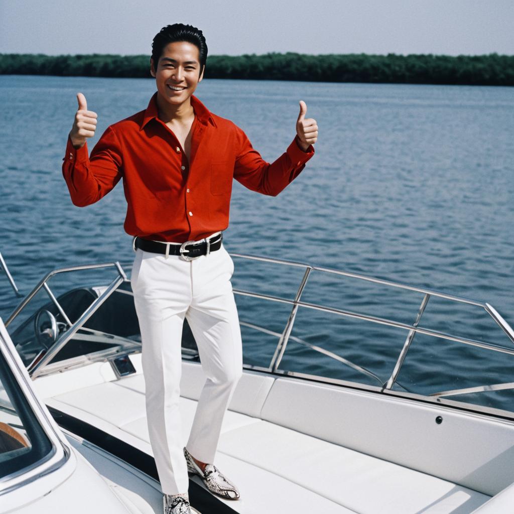 Chocolate Orange 1990 screengrab of male model Kazuma Kiryu wearing a red dress shirt with popped collar and sleeves rolled up, white suit pants, white snakeskin loafers, black leather belt with a silver buckle, stood on a speed boat, smiling and giving a thumbs up, muscular, fashion movie scene, Balenciaga commercial,