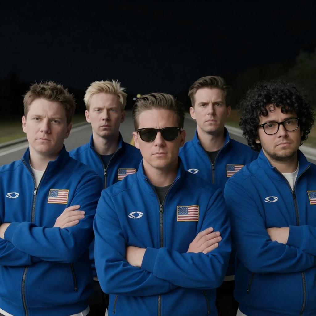 Photograph of four men in blue racing jackets, standing in a row with arms crossed. From left to right: brown-haired man with intense gaze, short-haired man with neutral expression, man with sunglasses and short hair, and man with afro and glasses. White background.
