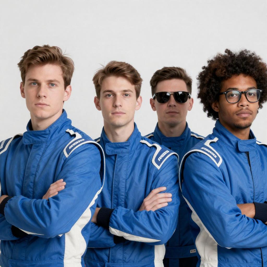 Four young men standing in a row wearing blue racing jackets with white accents. The group features diverse hairstyles including brown hair, short hair, afro, and one man wearing sunglasses. Arms crossed, posing confidently against a plain white background.