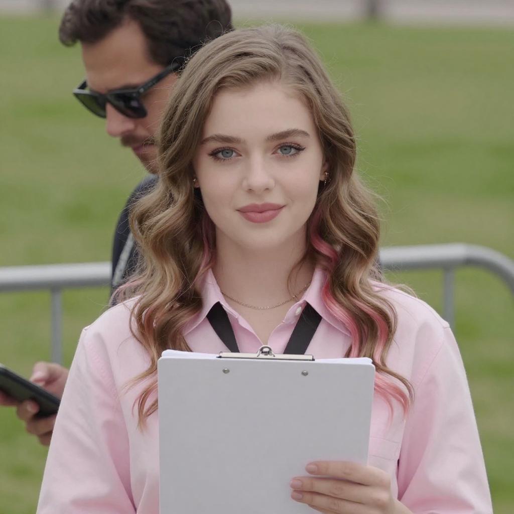 Photograph of a young woman with wavy, light brown hair with pink highlights, wearing a pink shirt, holding a white clipboard. She has blue eyes, full lips, and is smiling slightly. A man with dark hair and sunglasses is partially visible in the background. The setting includes green grass and metal barriers.