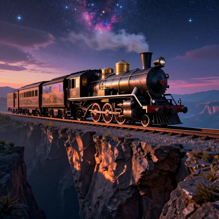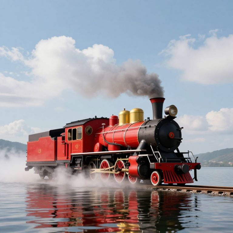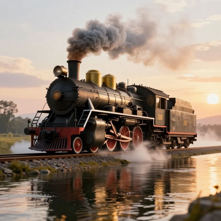 A computer-generated, high-definition illustration depicts a vintage steam locomotive gliding effortlessly across a serene river, its reflection shimmering beneath the golden-hour sunlight as it emits a plume of smoke against a dreamy sky.