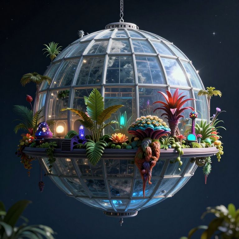 Photorealistic CGI: Glass globe chandelier filled with vibrant, colorful alien-like plants and glowing lights, suspended in a dark, starry night sky