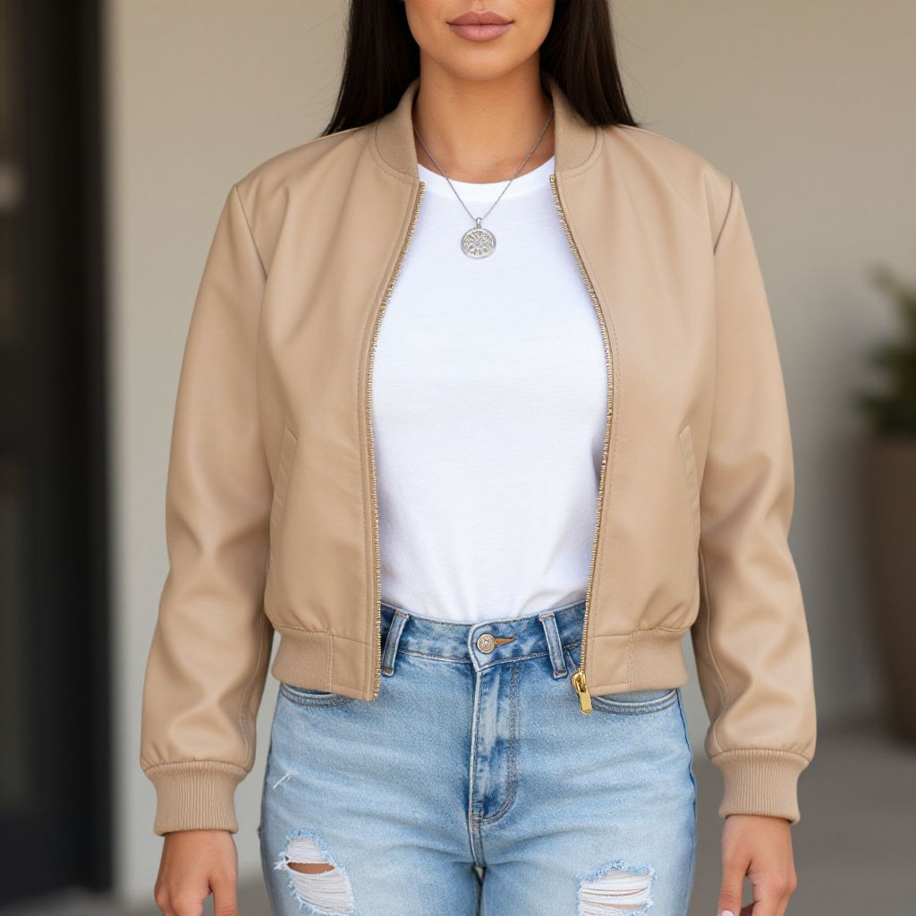 "Woman, casual, light tan faux leather bomber jacket, ribbed cuffs and hem, simple white t-shirt, light blue distressed jeans with rips along the legs, silver pendant necklace.. Sexy. Pretty face and beаutiful eyes. Big breasts."