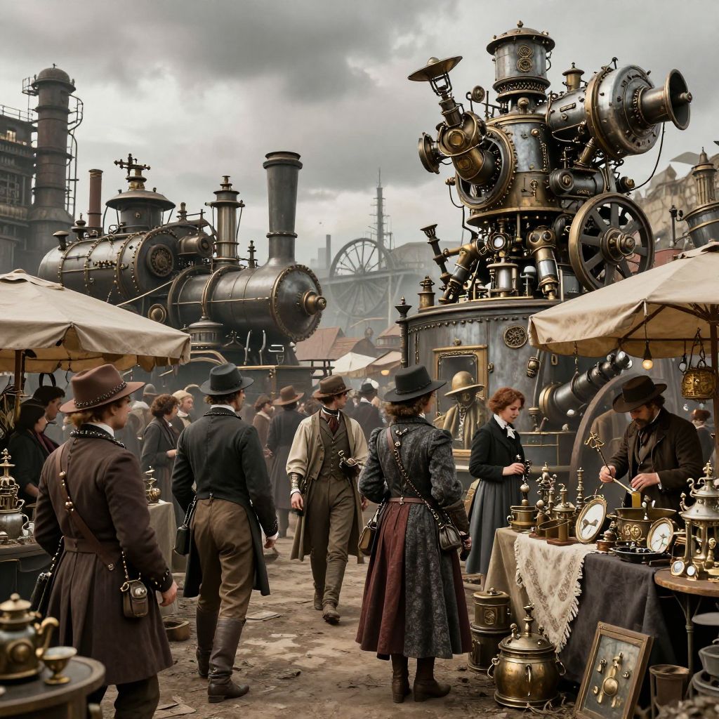 Steampunk market scene: Victorian-era people in period clothing browse antique steam machinery and teapots under beige umbrellas, with industrial backdrop. Photograph