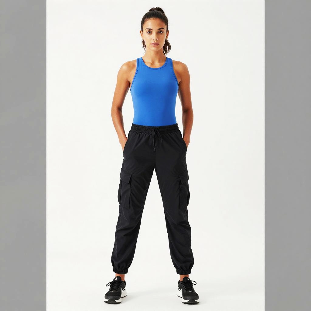 Photograph of a young woman with an athletic build, light brown skin, and dark hair tied back. She's wearing a blue sleeveless top, black cargo pants with the waistband hanging low, and black sneakers with white soles. She stands confidently with her hands in her pockets, set against a plain white background with gray borders on either side.