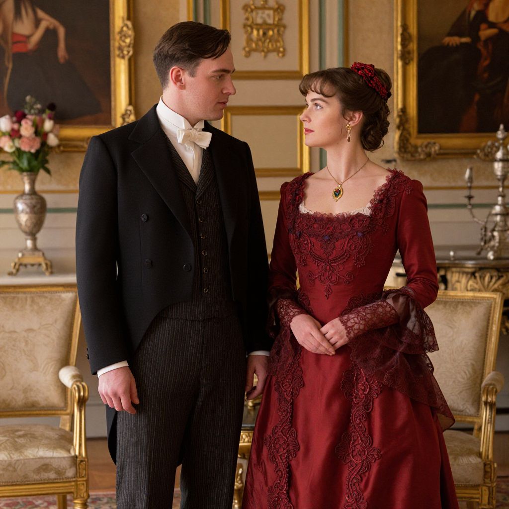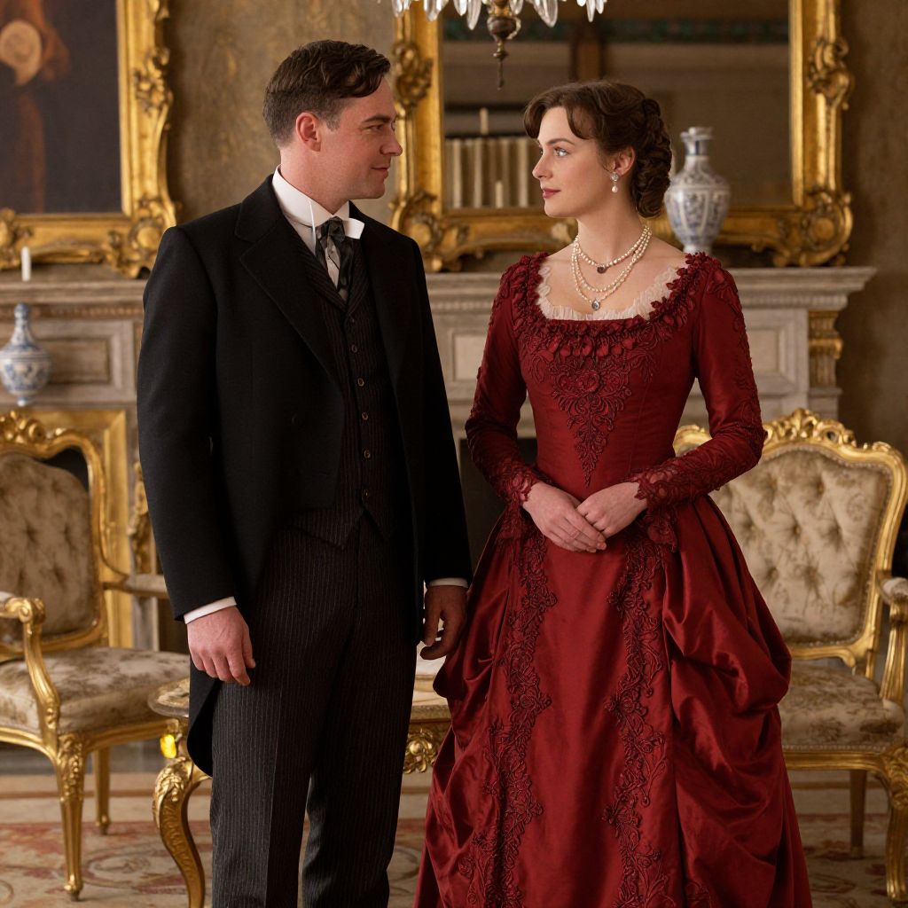 A high-definition, vintage-inspired scene reminiscent of \"Downton Abbey,\" featuring a man in a classic black suit and a woman in a rich red gown adorned with intricate lace detailing, set against a backdrop of opulent decor, warm golden hour lighting, and elegant period furnishings.