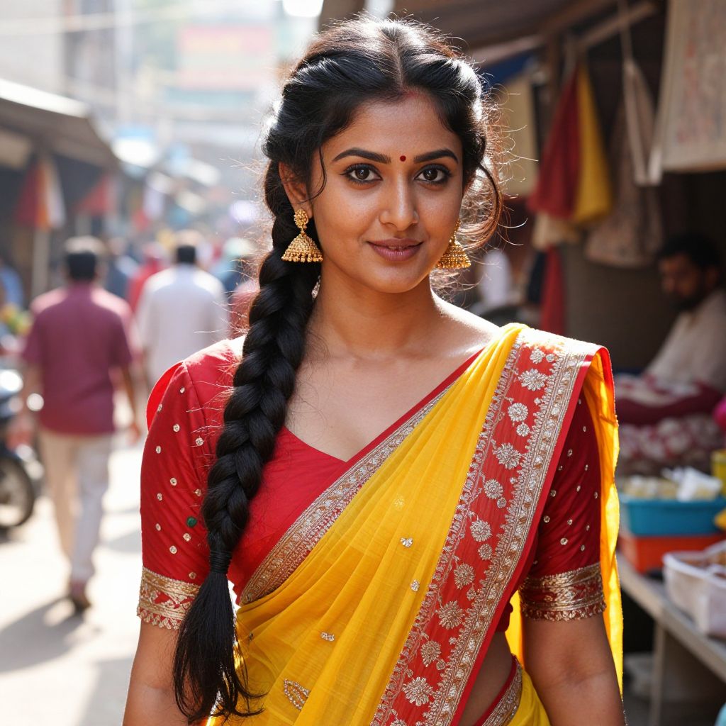 A beautiful South Indian woman with long, flowing black hair braided in a traditional updo with gold accents, wearing a vibrant traditional South Indian costume featuring a red-and-yellow saree with silver embroidery, standing in a bustling market in Chennai, sunlight streaming through the hawker stalls, her warm brown eyes focused on the camera, detailed textures of the fabric and braided hair visible in natural lighting.. The woman has big tits and cute face