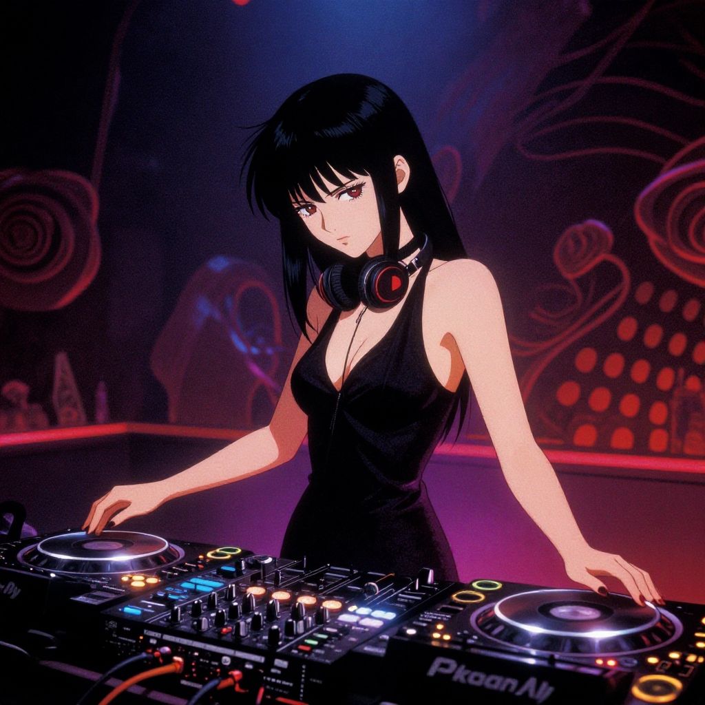 Digital anime-style illustration of a black-haired DJ woman in a sleeveless black dress, adjusting turntables in a dimly lit, colorful club with neon
