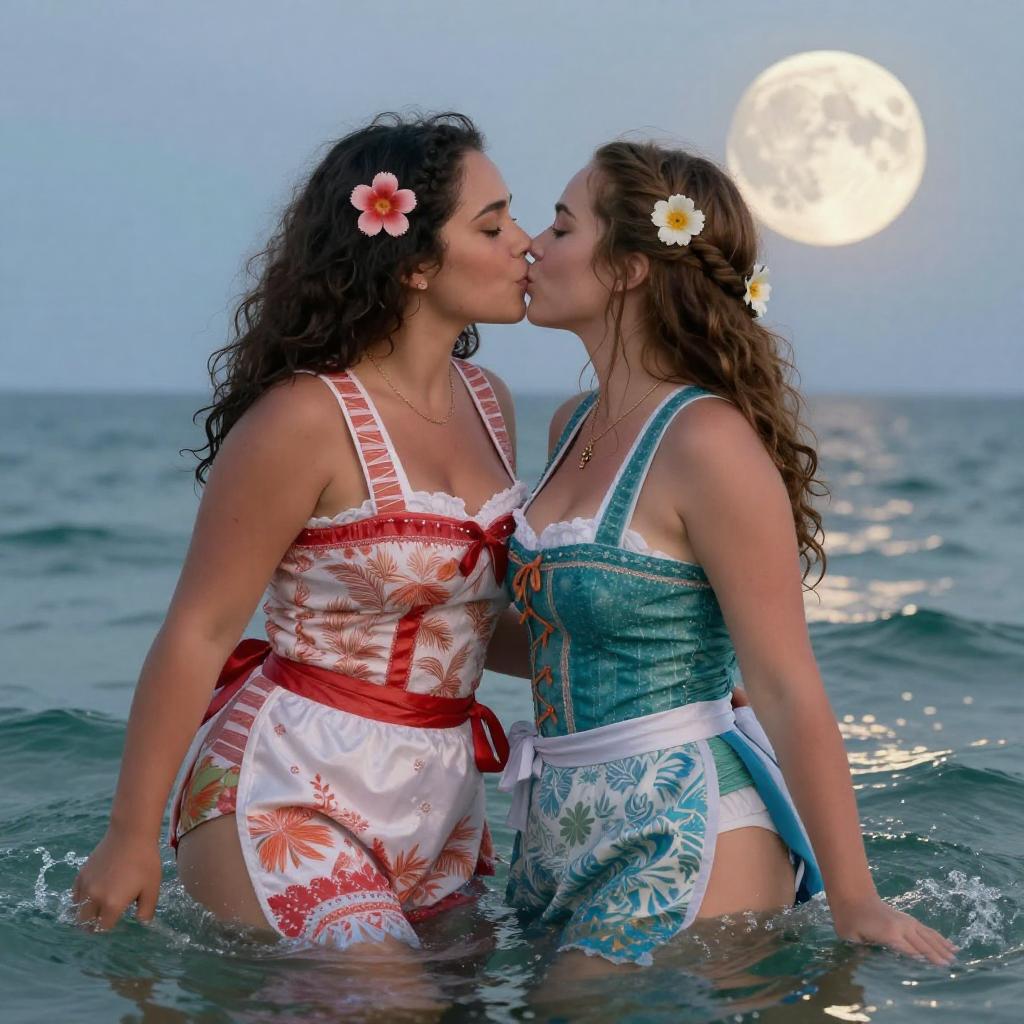 Dreamlikeart, Style-Moana, by Artgerm, WLOP, two women kissing, busty, Paige Spiranac, Natasha Romanoff, wading in the pacific (ocean:1.2), (partially submerged shot:1.2), sexy, big breasts, realistic, thicc, crisp quality, ((topless)), dirndl, full moon, long stylish hair, flowers