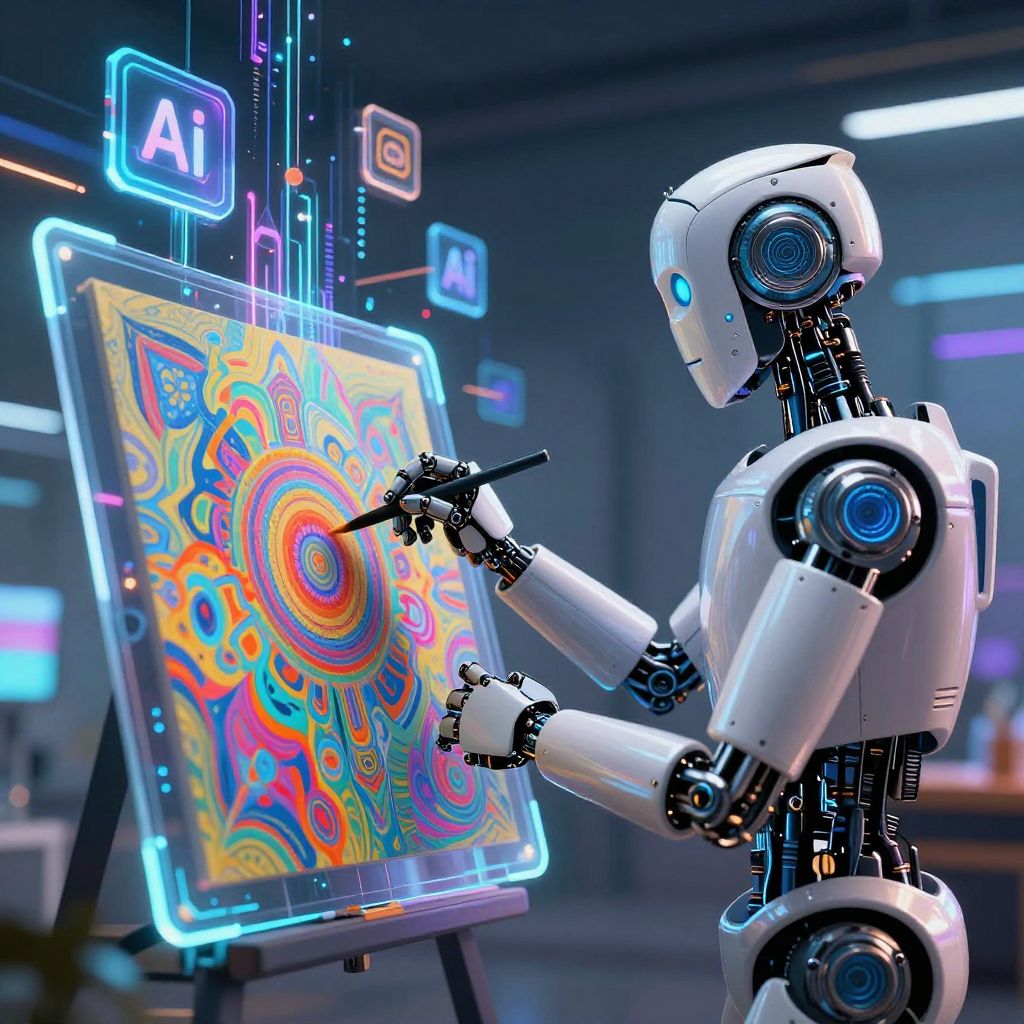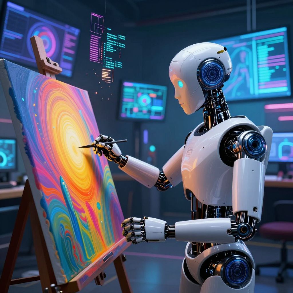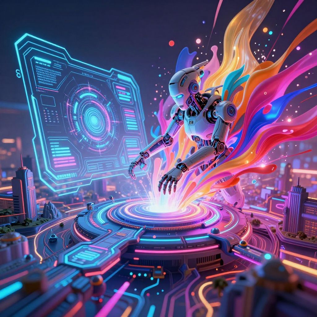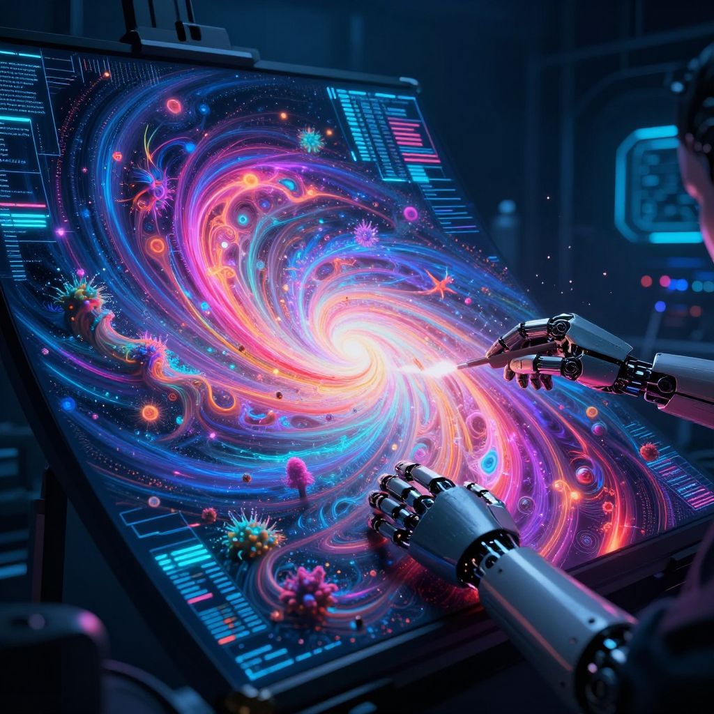 AI generates art on a giant virtual canvas, algorithms weaving swirling fractal patterns, neon colors exploding with electric energy, robotic hands delicately crafting hyper-detailed surreal landscapes under glowing data streams in a dark high-tech lab.