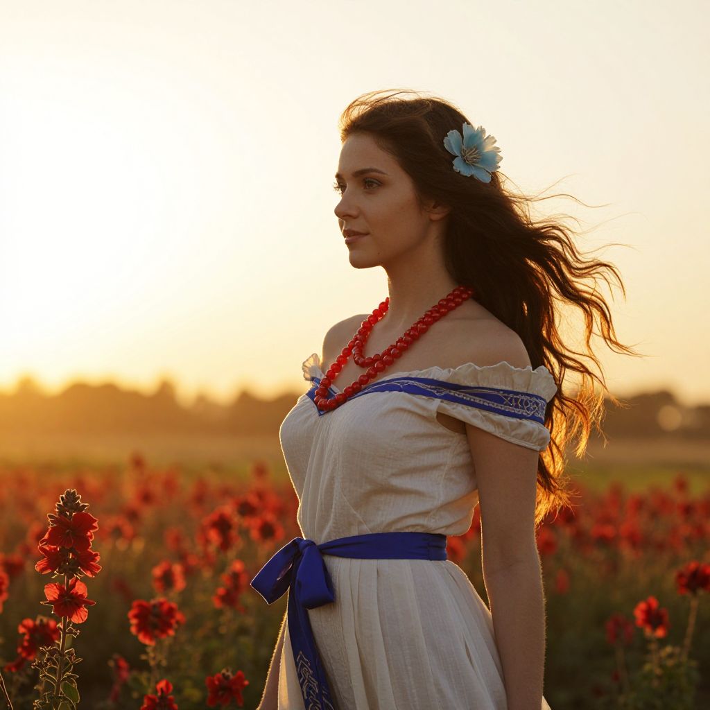 Radiant sunset bathes a young woman in golden light as she stands gracefully amidst vibrant red flowers, her flowing brown hair adorned with a delicate blue flower accessory and her elegant off-the-shoulder dress complemented by a red beaded necklace and a blue sash.