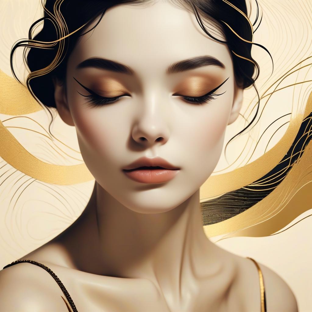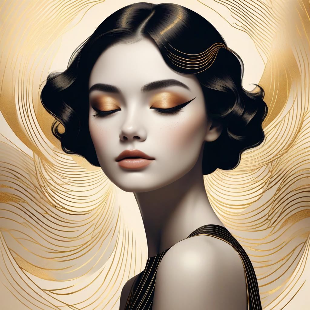 Minimalist portrait of elegant woman with closed eyes, outlined in black and gold tones, stylized eyelashes, geometric background with subtle wave patterns, art deco inspired, elegant and feminine aesthetic, soft lighting, high contrast, vintage illustration style.