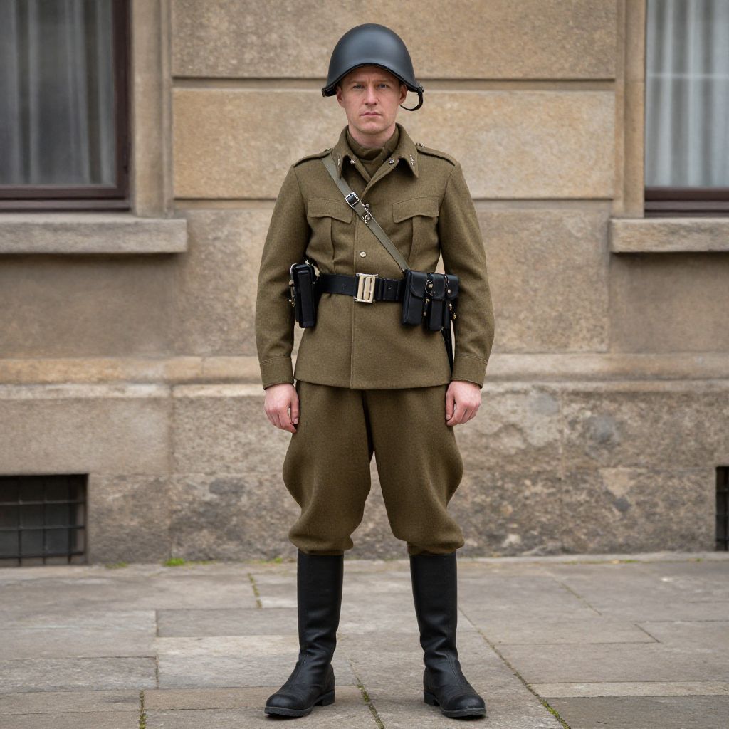 "World War One Soldier Costume, man in a uniform that is standing in front of a building"