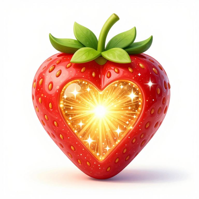 Radiant strawberry-shaped heart with a glowing golden core and sparkling star patterns, adorned with vibrant green leaves and a central stem, symbolizing energy and love.