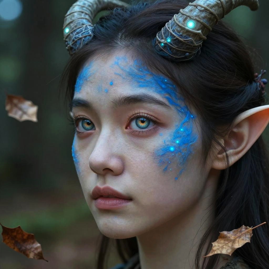 Photograph of a young woman with fair skin and striking blue eyes, adorned with blue glowing paint on her cheeks and forehead. She has dark, straight hair and wears metallic, curved horns on her head, and elongated, pointed ears. Small glowing dots are scattered across the blue paint. Her expression is neutral and she gazes slightly to the left. The blurred background features dark green foliage, with a few brown, dry leaves floating in the air. The overall lighting is natural, highlighting her face and the glowing paint. The image has a fantasy-themed, otherworldly aesthetic.