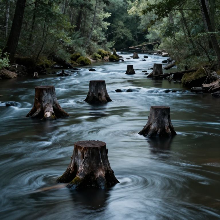 A serene forest bathed in mist conceals a surreal river flowing backward through a field of upright tree stumps, creating an otherworldly path where nature defies gravity and whispers secrets to those who dare to follow.