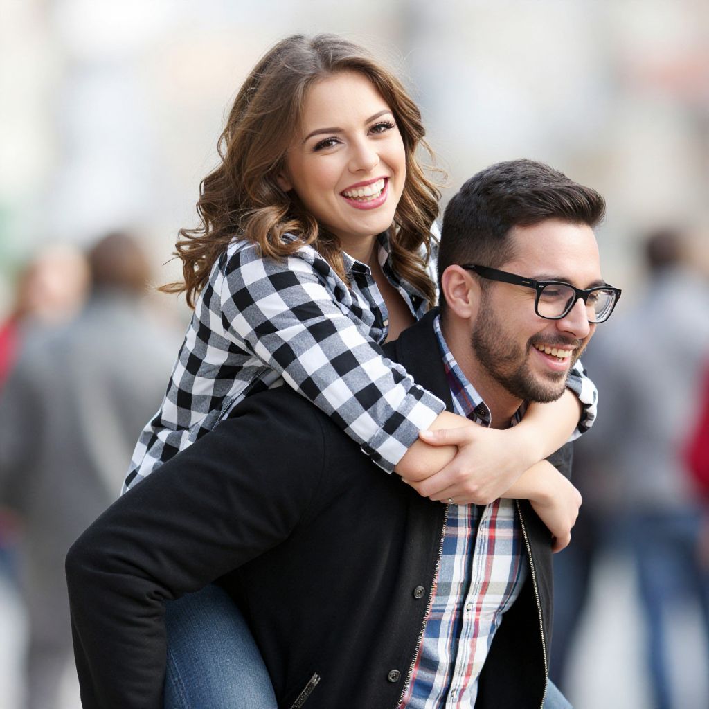 A bright, joyful photograph of a smiling couple. The woman with wavy brown hair and a black-and-white checkered shirt is playfully riding on the man's back. He has dark hair, glasses, a beard, and wears a black jacket over a plaid shirt. The background is softly blurred with people and light colors, emphasizing their happy expressions and fun moment.
