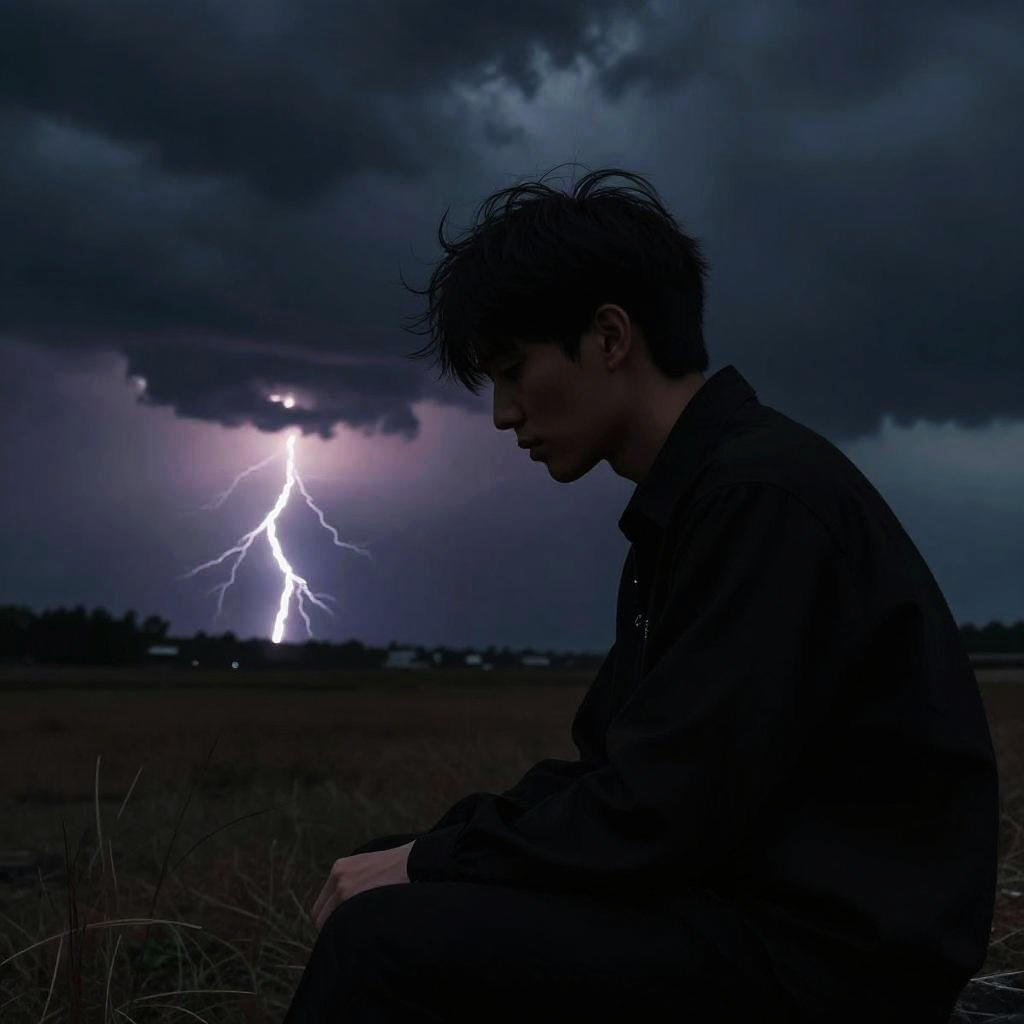 Depressed profile silhouette of a person against a dark, stormy sky with lightning in the distance, dramatic contrast, barely visible facial features, desolate landscape in the background, surreal and emotional atmosphere, painterly brushwork effect