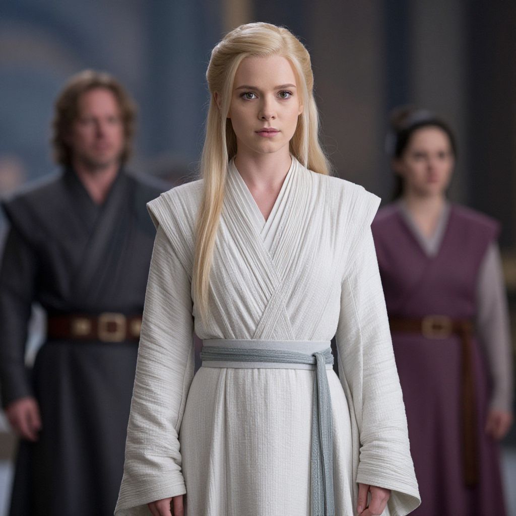 Photograph of a young white woman with long, straight blonde hair, wearing a white, long-sleeved, wrapped robe with a gray belt. She stands in the foreground, looking directly at the camera with a neutral expression. In the blurred background, two men and one woman are visible, dressed in darker, medieval-style attire with belts. The lighting is soft, emphasizing her white robe against the darker backdrop. The overall style suggests a fantasy or sci-fi setting, possibly inspired by Star Wars. The woman's robe has a textured, slightly ribbed fabric.