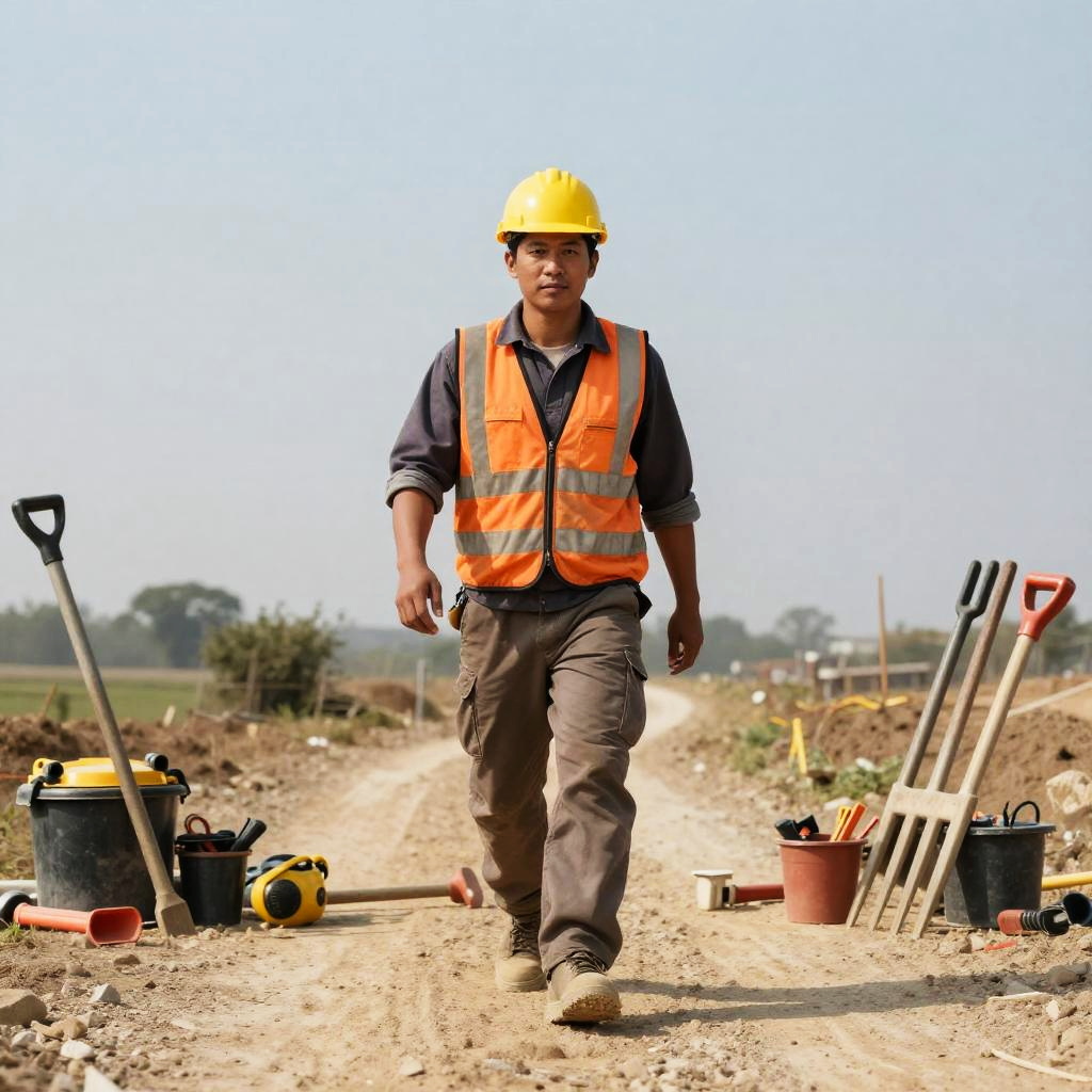 Realistic photo.Innovative medium shot of a construction worker walking on a rugged dirt path full of tools and a fork in the road, award winning studio photography, professional color grading, soft shadows, no contrast, clean sharp focus, film photography realistic photo