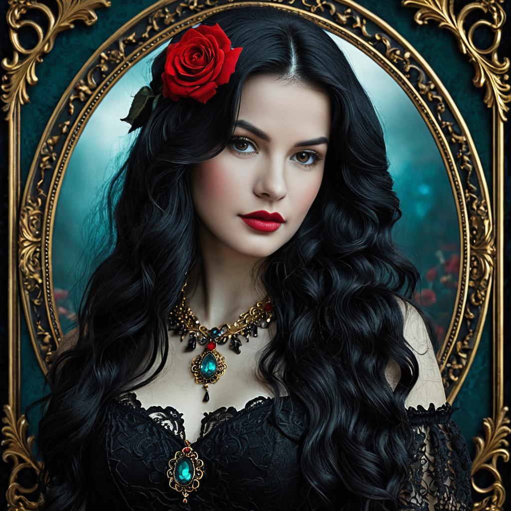 Black long wig halloween, photorealistic portrait of a beautiful woman with long black wavy hair, red rose in her hair, wearing a detailed black lace dress, teal and red gemstone necklace, piercing blue eyes, fair skin, serious expression, background with a blurred dark grey and gold ornate frame, digital art, highly detailed, gothic style, fantasy, realistic lighting