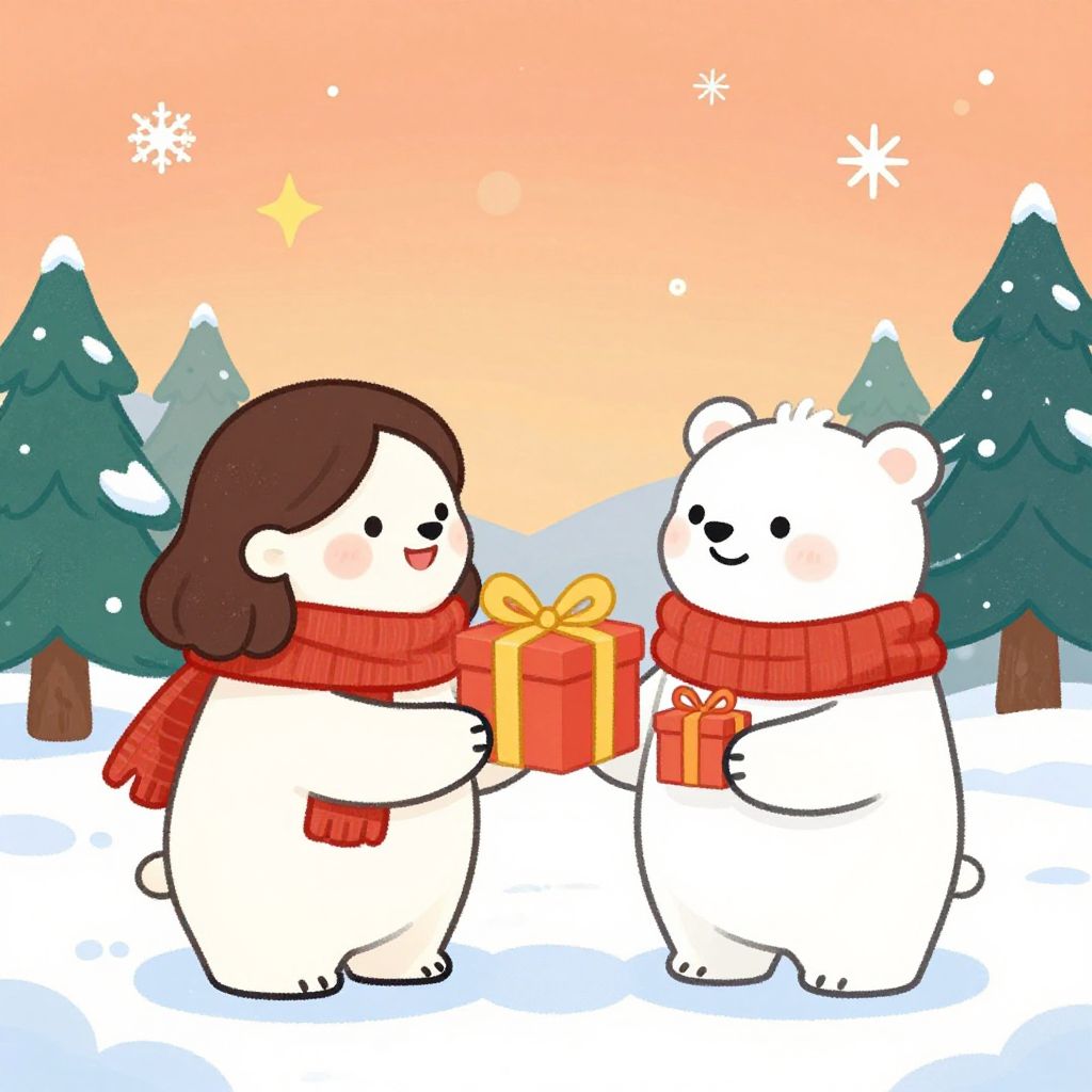 Cheerful winter scene featuring a smiling woman presenting a gift box tied with a yellow ribbon to two adorable polar bear characters, both wearing scarves and holding small gifts, set against a festive backdrop of orange skies, snowflakes, stars, and evergreen trees.