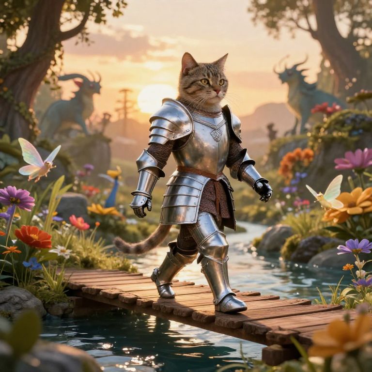 A digital illustration depicts a tabby cat in shiny silver medieval armor, standing on a wooden bridge over a flowing stream in a vibrant, fantasy garden. The cat, with green eyes and a focused expression, is surrounded by colorful flowers, butterflies, and lush greenery. In the background, a glowing sunset casts a warm orange and pink light, with stone statues of mythical creatures like dragons and unicorns. The armor includes a chest plate, shoulder guards, gauntlets, and greaves, with a brown cloth skirt. The scene is whimsical and fantastical, combining elements of medieval fantasy with a serene natural setting.