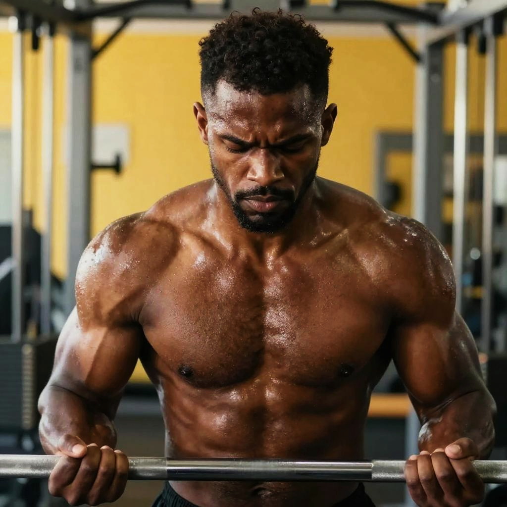 Photograph of a muscular Black man with short, curly hair standing on a rooftop at sunset. He's wearing a tight, gray T-shirt and black athletic pants, flexing both biceps while standing in a wide stance. His shadow is cast behind him, and the city skyline is visible in the background. He's wearing black sneakers and has a confident, strong presence.