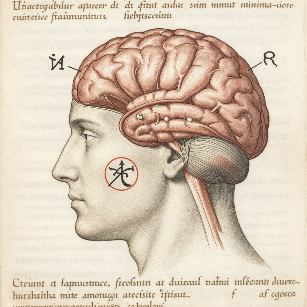 An anatomical manuscript with a detailed illustration of the human head and brain, featuring medieval alchemy symbols and Latin text.